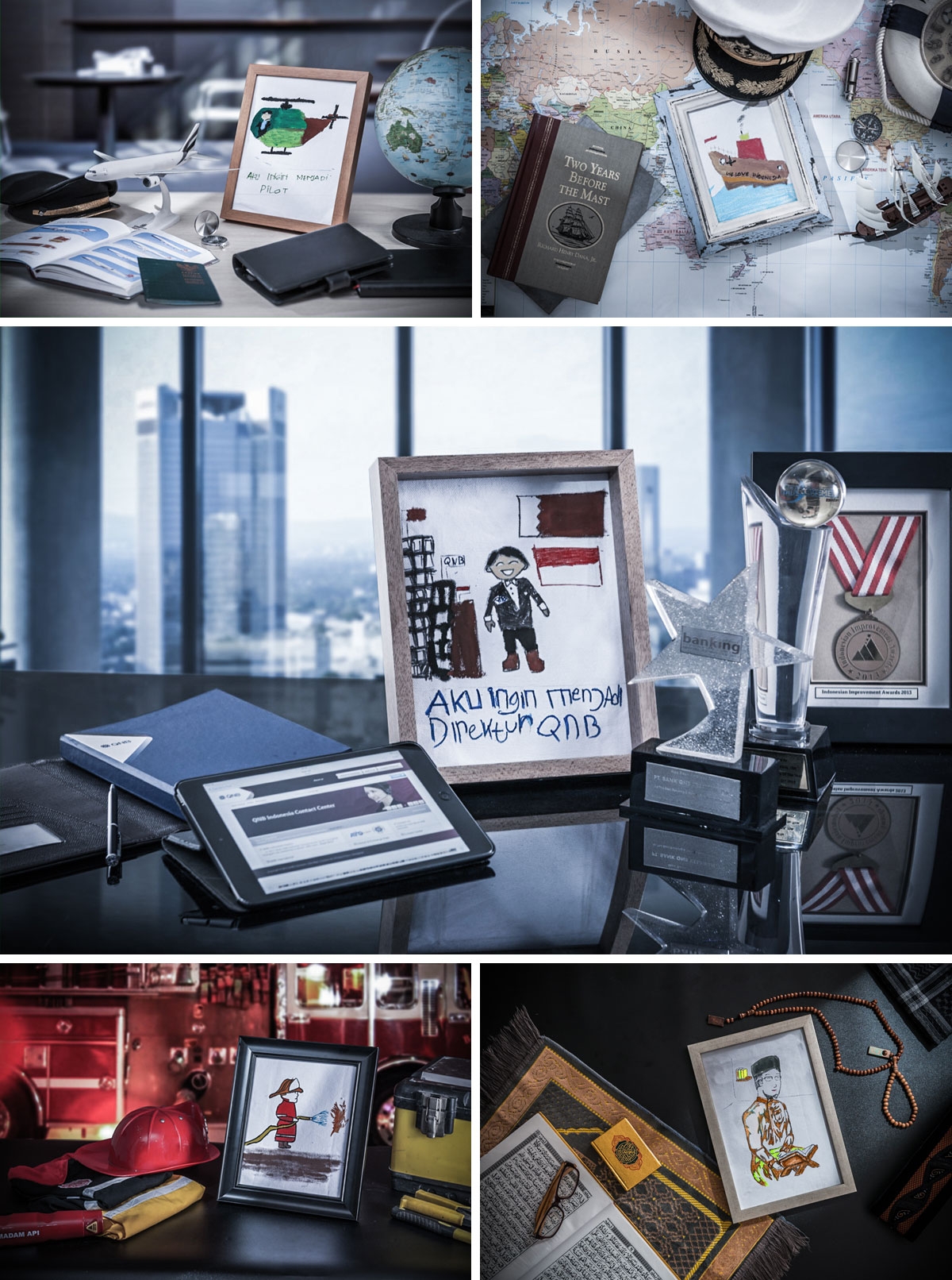 The photoshoot concept was to capture children's dreams and ambitions for the future. The best drawings that were handmade by children at QNB's CSR event was selected to be shot in a still-life photography setting. The final photos portrays a nostalgic mood to reflect each child's honest dreams and authentic personality.